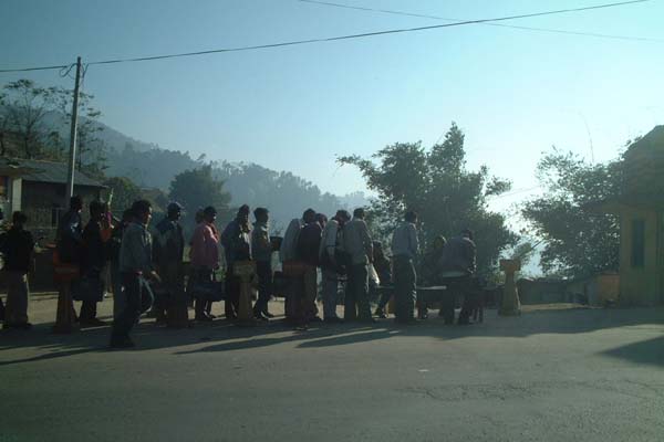 當地民眾皆須下車排隊,由荷槍的軍人一一檢查行李,再步行一小小段的路才上車,車子也要檢驗。當然因為我們是觀光客而的一倖免。感覺上,我們似乎還特地繞路去檢查!之後又經過了無數個檢查站,多的難數。聽說這跟2001年Nepal皇室喋血有關,現在的人民不滿新的國王,而國王為了防止人民叛變,只好更加的嚴格。 |
