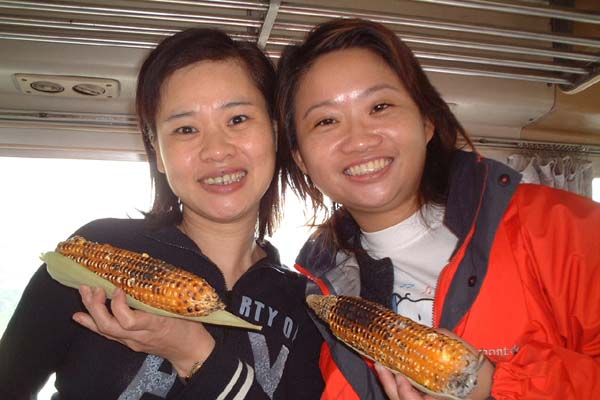 半路上停下來買香蕉,其實是比較樣台灣的芭蕉,婦人剛好在烤玉米,本來是沒人要吃的,後來因為maggie要吃,我也就順便吃吃看,接著paddy也好奇的跟進,接著幾個不怕的也有吃!玉米去皮後直接放在碳裡烤,烤的焦黑,也難怪許多人不敢吃,倒是直接用玉米皮讓我們拿很有智慧,又環保自然。 隨後paddy帶頭將果皮丟往窗外,說是會腐爛,回歸大地,覺得有理也跟進。不過在之後的亂丟後,覺得後悔,也許會被Nepal人認為我們是這樣的國家。 |