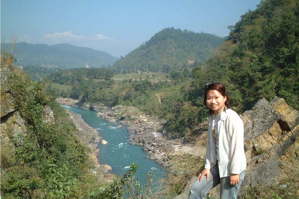 車子沿著翠蘇里河(Trisuli)走,河裡有人正在泛舟。沿路少見男子,多半是婦人小孩再敲打石頭,將河谷理得石頭敲小,造路?覺得奇怪,不過也看到大理石石片。許多連接的房舍門口外都會有個共用的水龍頭,及巨大的天平,天平剛好拿來秤石頭吧?!