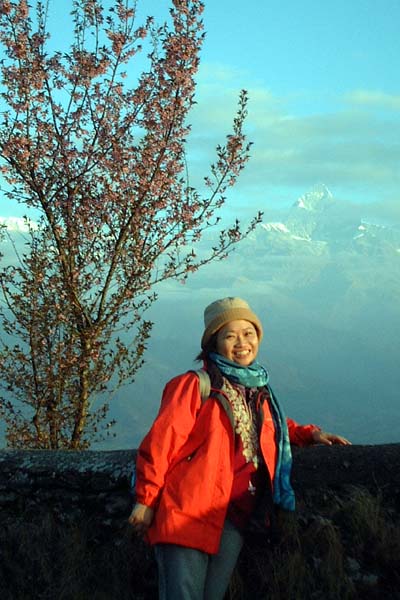 背後的魚尾峰還在雲中,如果沒有雲,我想一定很美,一旁雪白的高山被日出映的珠紅,好美麗喔!一心的不甘還是等不到雲散開,一顆盛開的櫻花頻添風情。但是一直到現在寫回憶錄為止,我還是搞不清魚尾峰,到底是怎麼個相法?