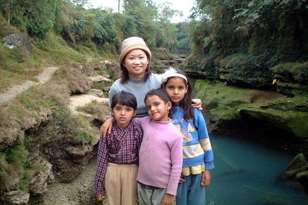 波卡拉不止只是登山者的天堂,也是地質研究人員的天堂,這兒的地勢真是奇特,所有的河谷都向下侵蝕,但它卻卻向下侵蝕成一個個洞,而且忽然間下蝕至不見底的河谷。好奇心驅使我想往上游走,當然也是因為有幾個老外正在那邊,導遊找不到路正打算走時,望見他們回來的路,便延他們的路走,可大家都覺得難走不前往,不怕死的琦琦還是勇往直前,沒想到那三個小孩也跟來了,我想是想要糖果吧!可惜發完了。回程發現一條超短的小路,不過回到平地後需要爬過一個圍牆,圍牆上用板岩一片片坎入,非常的特別也顯示其巧思,好後悔沒照回來。