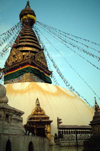 前往一座矗立於市區西郊山丘的『蘇瓦揚布那佛塔』,又稱四眼天神廟、小眼睛廟或猴廟。傳說古時加德滿都為一座美麗湖泊,湖中盛開一朵蓮花,而就生長於此地。從這座古蹟週邊,可俯瞰谷地各角落景色一覽無遺;佛塔四面都畫有釋迦牟尼的佛眼,象徵著佛眼無邊。